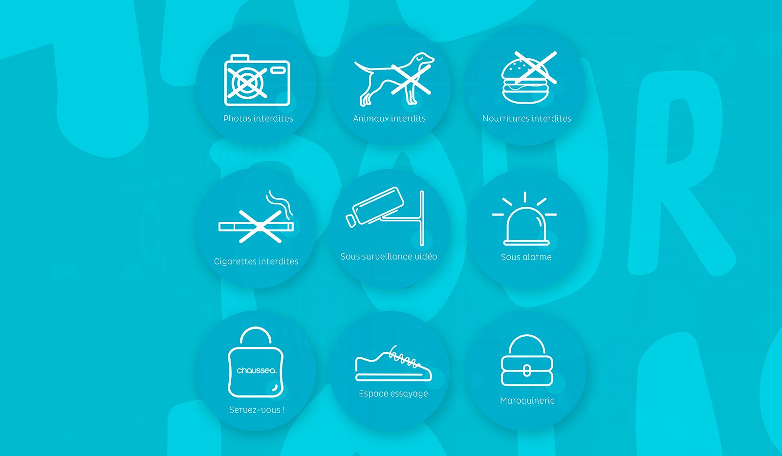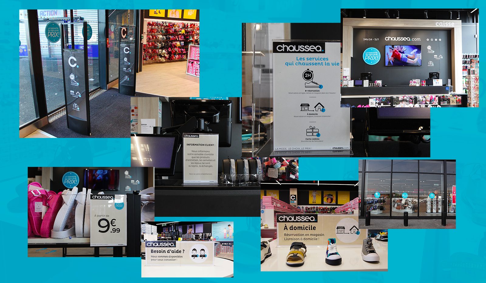 Un magasin c’est grand et dans un magasin, il y a beaucoup de supports de communication. La première idée a été de revoir l’ensemble de la charte graphique magasin afin de l’uniformiser et de la simplifier. Déclinaison du logo Chaussea en ”C”, création de nouveaux pictogrammes repérage clients, PLV, ILV, bâches parcours clients, caisses, vitrines, enseignes repensées : tout y passe.
